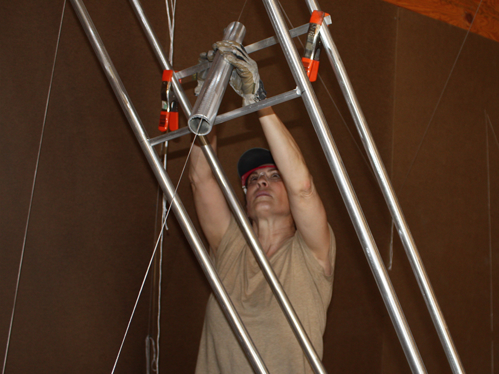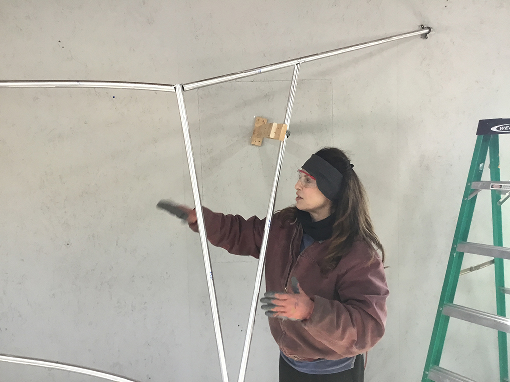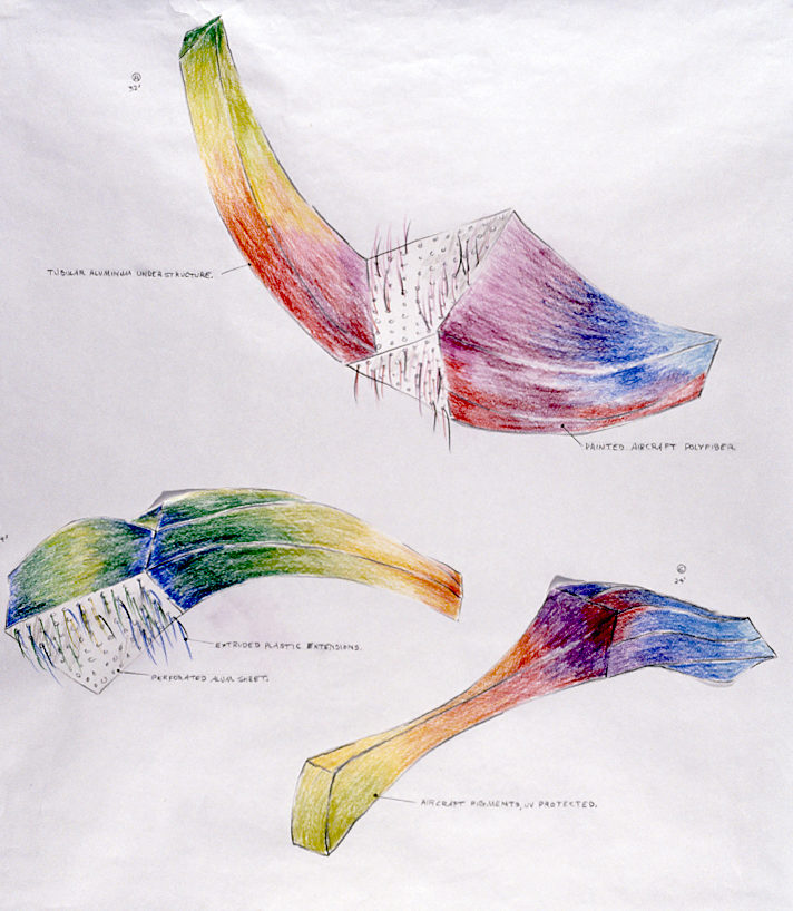 The materials for my linear frameworks are aluminum for my indoor work and aluminum or stainless steel for my outdoor work. The material that defines the planes on the sculptures is Fabric. The fabrics I use are translucent and man-made polyfiber, and spun lutradur. Both of these allow for the encased volume of the sculptures to play a major role. I am currently creating an off-shoot using screen printing methods on the fabrics and vinyl for photographic process to be involved in specific concepts. My outdoor work favors thin sheet and perforated metals as sheathing on the forms.