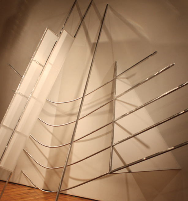 At this time, I had ‘left the wall’ and was exploring free-standing sculpture. The work was all about the purity of line, and the exterior shell of the sculptures integrating with the interior space, pulling the viewer around and in visually. Shadows from actual lines, become complex when they combine with those case. My interest in balance is becoming evident, most strikingly in ‘Precarious’. I enjoy creating two-dimensional framed pieces that are derivative from the sculptures, and began a new series of sculptural deconstructions to accompany several of them. ‘Cantilevered Plane’ is the perfect example of this endeavor, specifically placed on the back wall of the gallery.